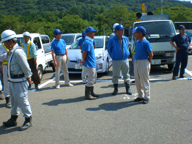 連日猛暑が続く中、期待に反して今日も強い日差しの中での作業となりました。作並のチェーン着脱場に集合し、仙台西国道出張所・横山所長の挨拶をいただき、管理係・佐藤さんからは作業についての説明と熱中症に注意するようにとのお話がありました。その後各班ごとの持ち場に別れて作業に着手しました。